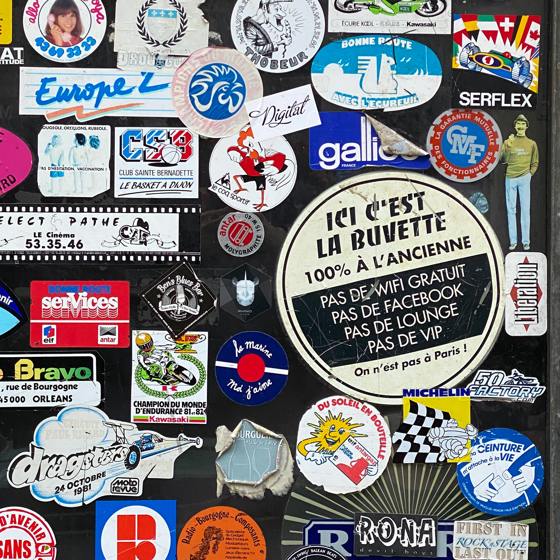 Stickers on the door of La Buvette, a bar in Orleans, France. I love the round one that says "This is La Buvette, an old school bar. No Free Wifi. No Facebook. No Lounge. No VIP. We are not in Paris."